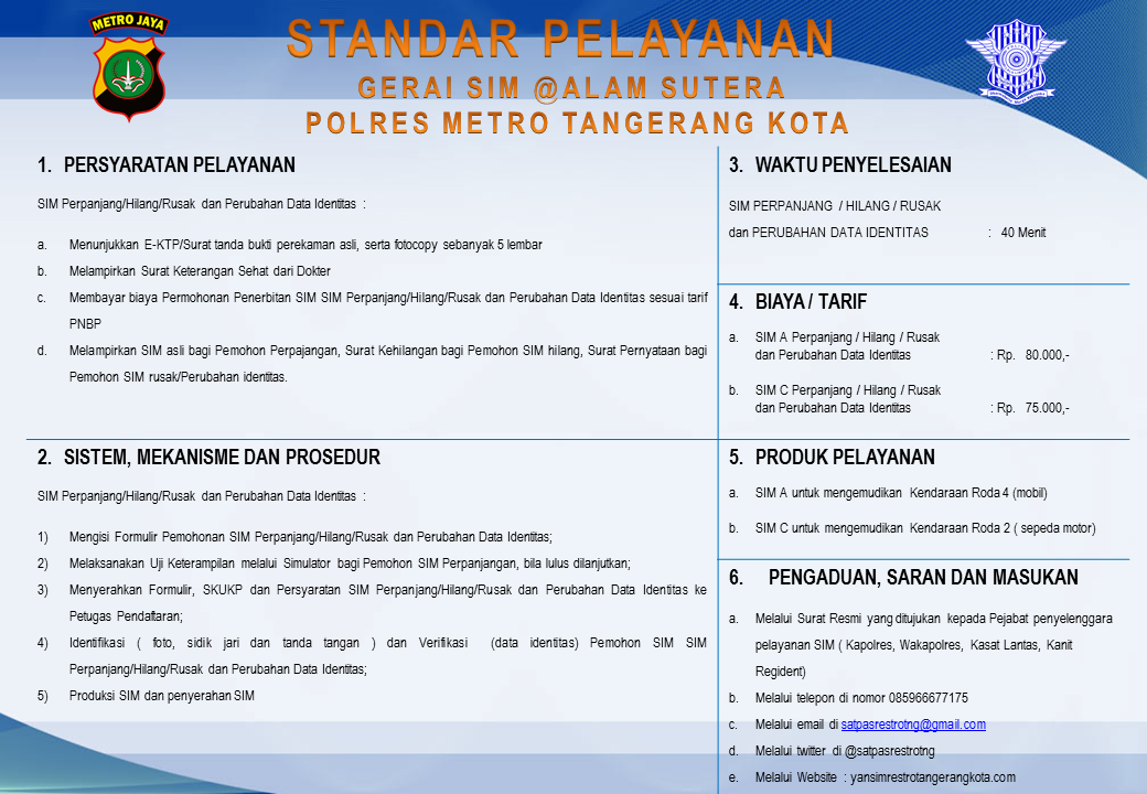 Dalam rangka mewujudkan penyelenggaraan pelayanan publik yang sesuai asas penyelenggaraan pemerintahan yang baik dan guna mewujudkan kepastian hak dan kewajiban pihak yang terkait dengan penyelenggaraan pelayanan, serta dalam memberikan acuan dalam penilaian ukuran kinerja dan kualitas penyelenggaraan pelayanan, maka Standar Pelayanan untuk Penerbitan SIM telah ditetapkan berdasarkan Keputusan Kapolres Metro Tangerang Kota Nomor : KEP/76/VI/2022 tanggal 8 Juni 2022 tentang Penetapan Standar Pelayanan Publik Polres Metro Tangerang Kota